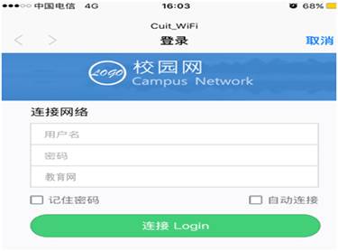 目前我校两校区行政楼、图书馆、教工食堂,航空港校区双中心、信息楼、气象楼、资环楼等区域已开通无线网络,无线信号名称为Cuit_WiFi。教职工的用户名和密码为网络存储的用户名和密码(默认选择服务为教育网);学生用户如果在宿舍开通了宽带,选择相应的运营商网络登录,用户名和密码为宿舍上网的用户名和密码(电信宽带用户暂时无法使用,伟德国际1949正在与中国电信协商)。界面如下: