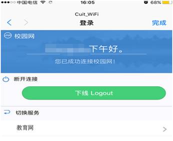 教育网一栏可以选择所开通的营运商名称(教育网、移动、联通),连接成功界面如下: