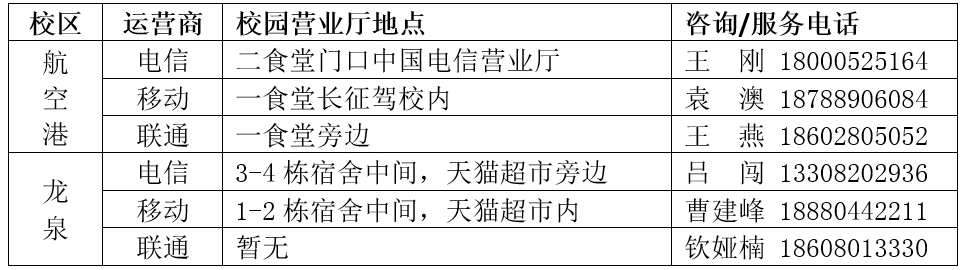 附:各运营商校园营业厅地点及服务联系方式