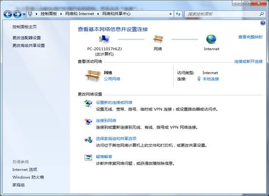 进入“网络和共享中心”后,点击“更改网络设置”栏目下的“设置新的连接或网络”