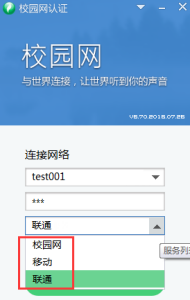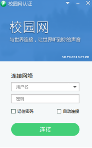 2、校园网用户:用户账号为学号,密码与原有认证系统一致,选择“校园网”登陆即可,如下图所示:(首次登录默认为校园网,会根据账号类型下发不同服务到客户端)