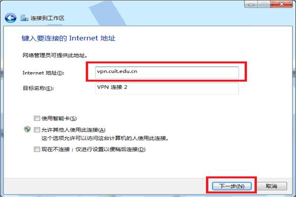 第六步:将internet地址填写为:vpn.cuit.edu.cn ,然后点击下一步;