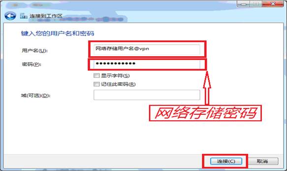 第七步:键入用户名和密码界面,将用户名填写为“网络存储用户名@VPN”,密码填写为网络存储密码,然后点击“连接”;