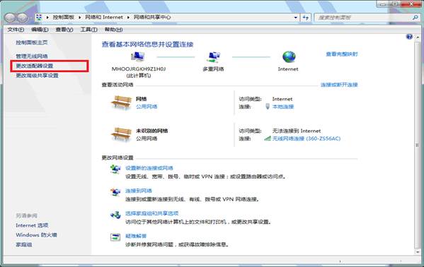 第一步:返回到“网络共享中心”界面,点击左上角的“更改适配器设置”;