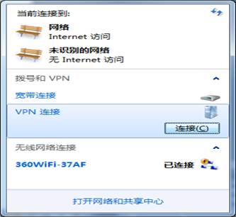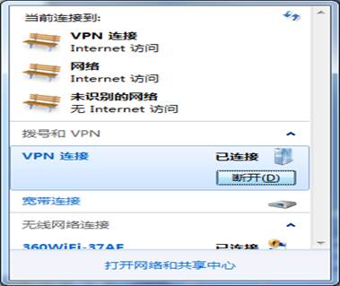 当您不再需要使用VPN服务时,请点击屏幕右下角“打开网络和共享中心”,选中“VPN连接”点击“断开”即可,如下图
