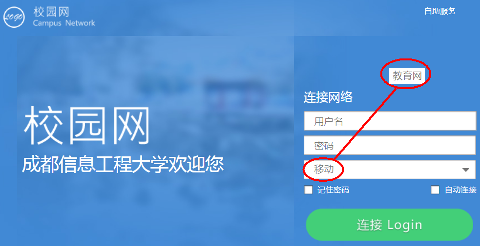 2.教学区有线网:中国移动校园网套餐用户上网认证时选择“移动”,其余用户上网认证时选择“教育网”。